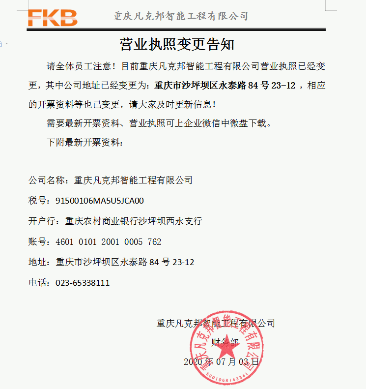 请全体员工注意!目前重庆凡克邦智能工程有限公司营业执照已经变更,其中公司地址已经变更为:重庆沙坪坝区永泰路84号23-12,相应的开票资料等也已变更,请大家及时更新信息!