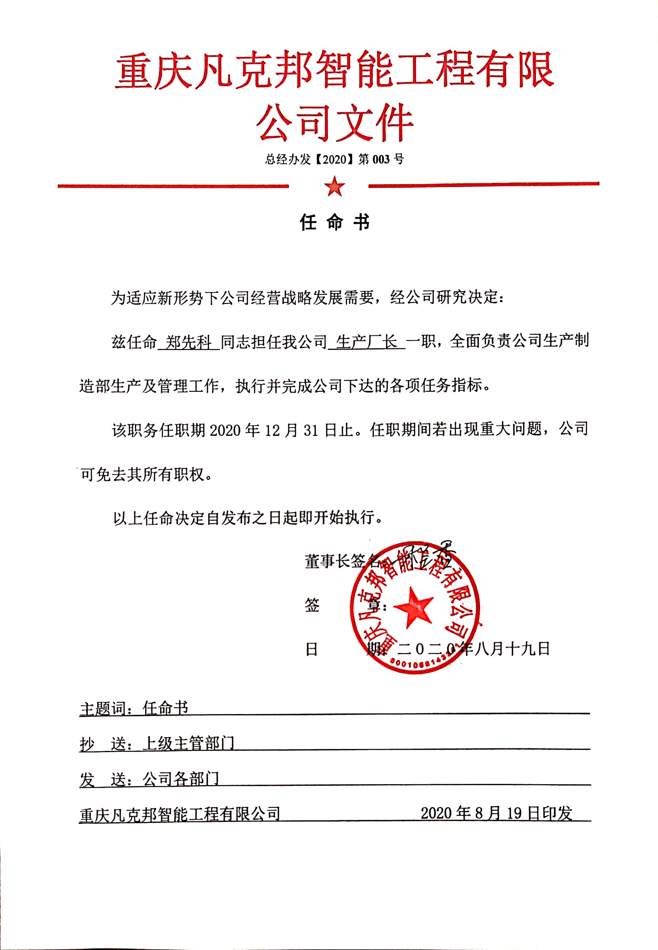 兹任命郑先科同志担任我公司生产厂长一职,全面负责公司生产制造部生产及管理工作,执行并完成公司下达的各项任务指标。