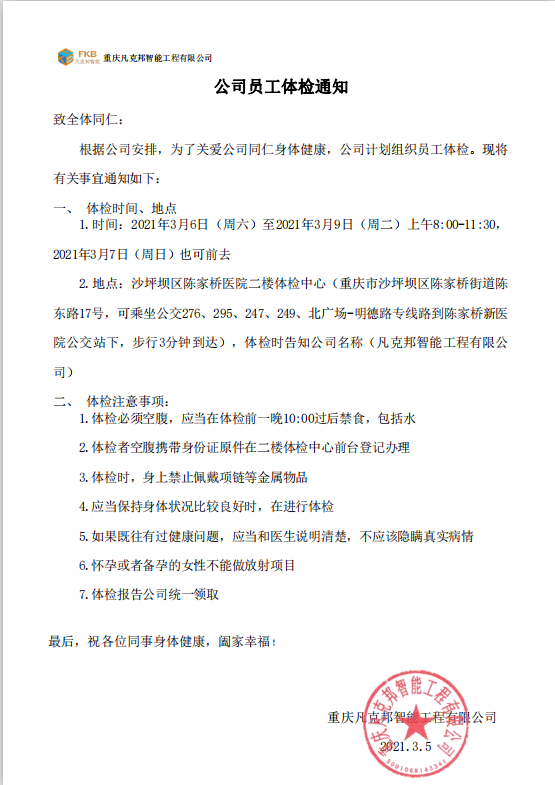 2.地点:沙坪坝区陈家桥医院二楼体检中心(重庆市沙坪坝区陈家桥街道陈 东路17号,可乘坐公交276、295、247、249、北广场-明德路专线路到陈家桥新医 院公交站下,步行3分钟到达),体检时告知公司名称(凡克邦智能工程有限公司)