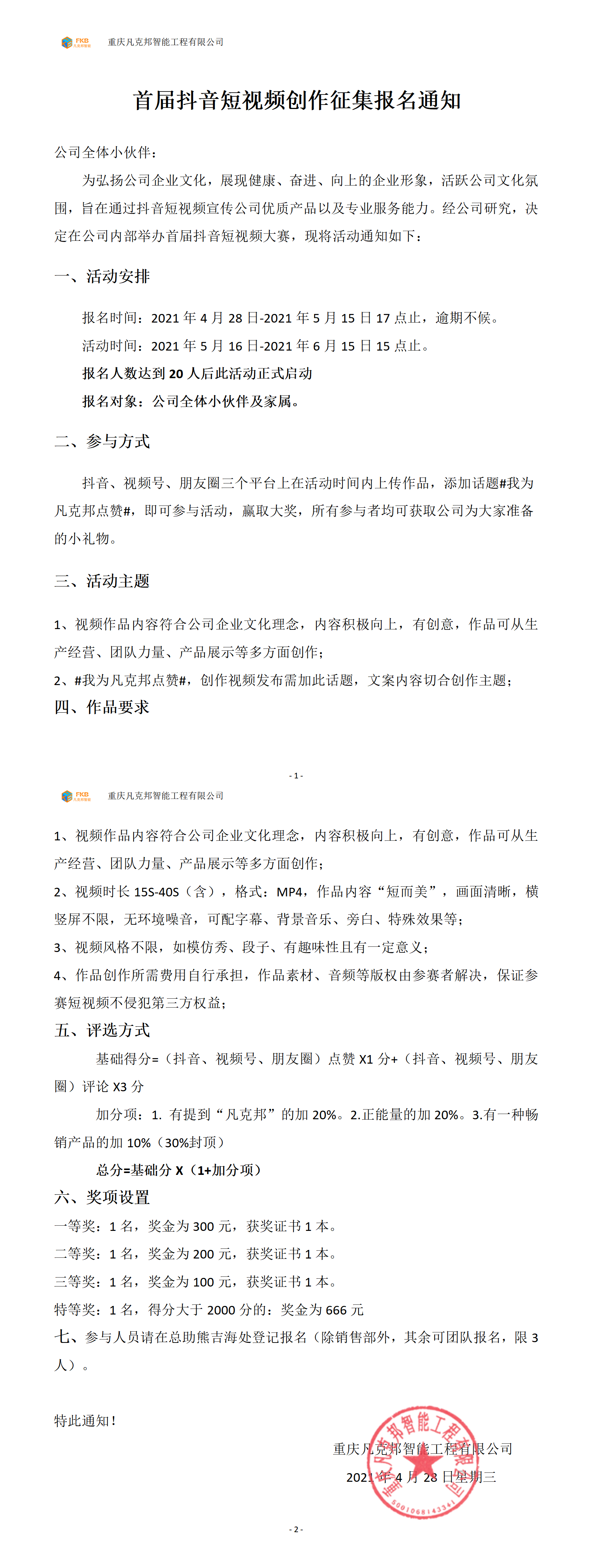 为弘扬公司企业文化,展现健康、奋进、向上的企业形象,活跃公司文化氛围,旨在通过抖音短视频宣传公司优质产品以及专业服务能力。经公司研究,决定在公司内部举办首届抖音短视频大赛,现将活动通知如下: