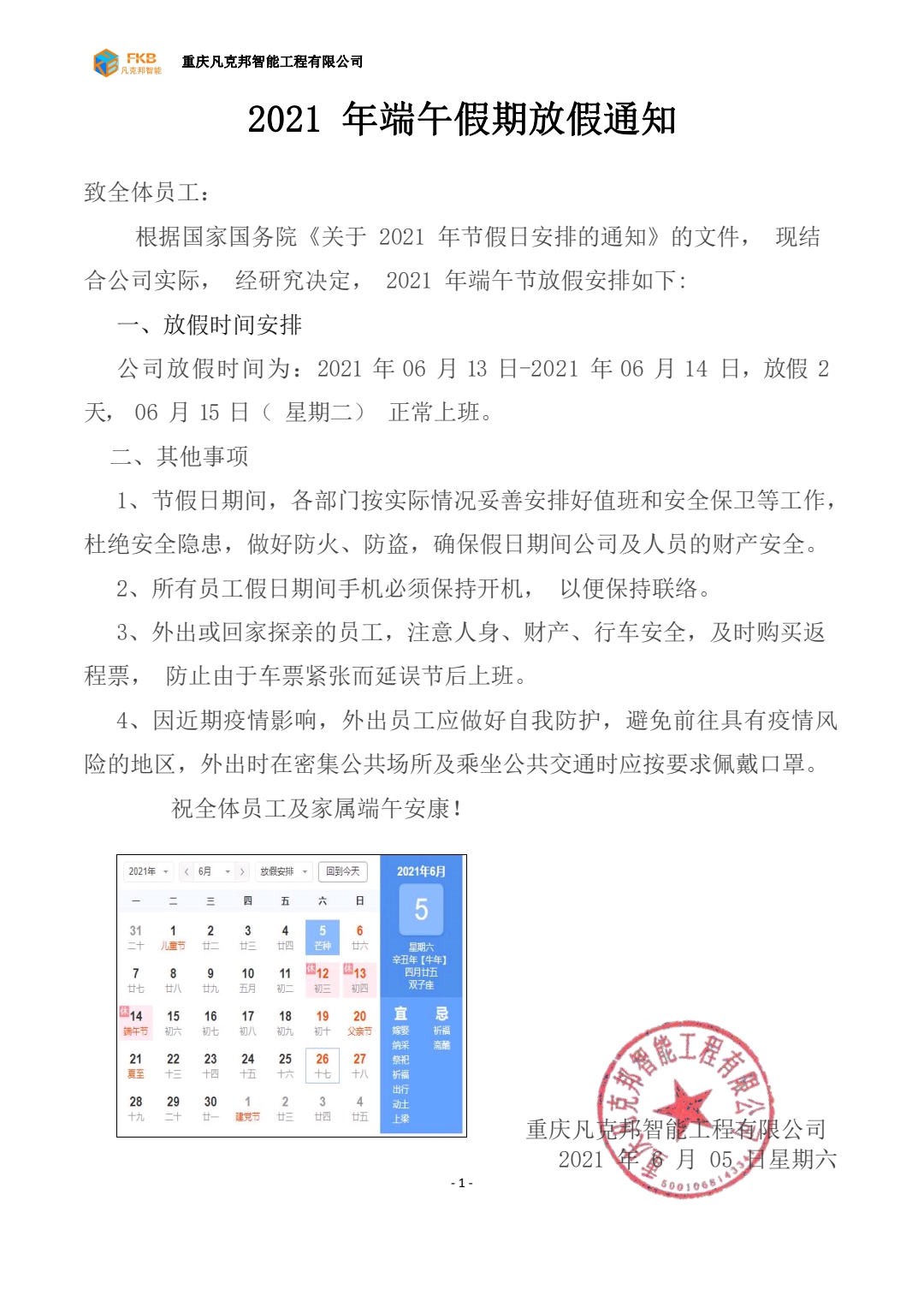 公司放假时间为:2021年6月13日-6月14日,放假2天,6月15日(星期二)正常上班。